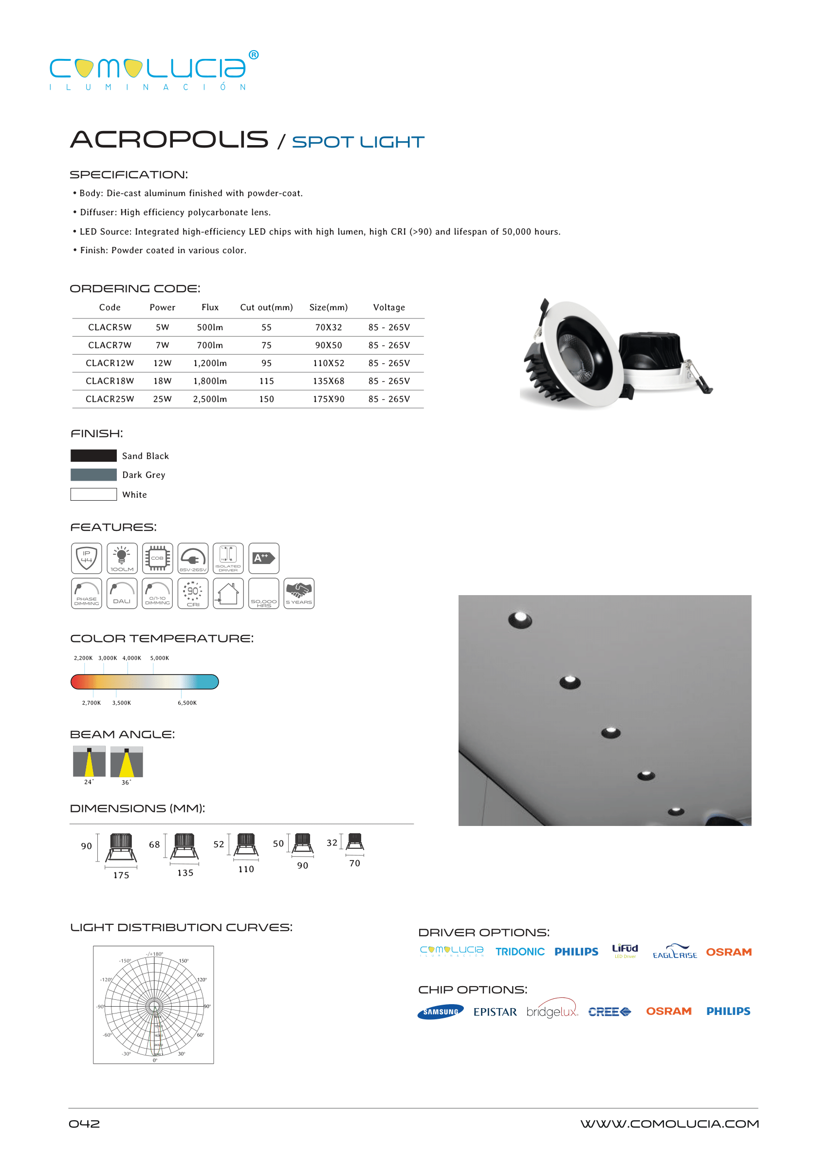 - LED Source: Integrated high-efficiency LED chips with high lumen, high CRI (>90) and lifespan of 50,000 hours. Finish: