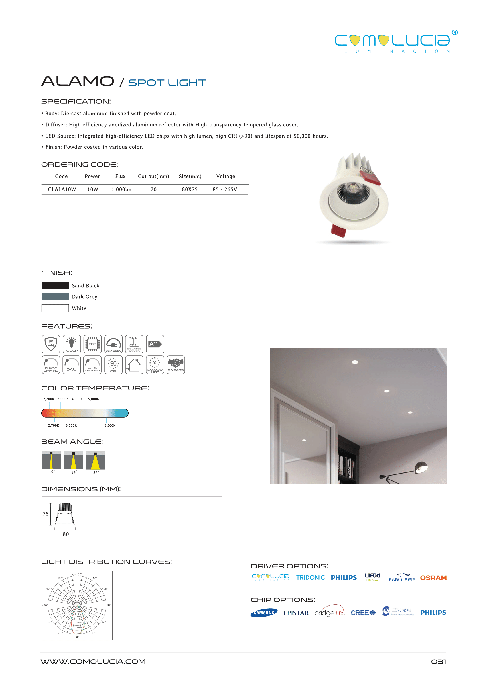 - LED Source: Integrated high-efficiency LED chips with high lumen, high CRI (>90) and lifespan of 50,000 hours. Finish: