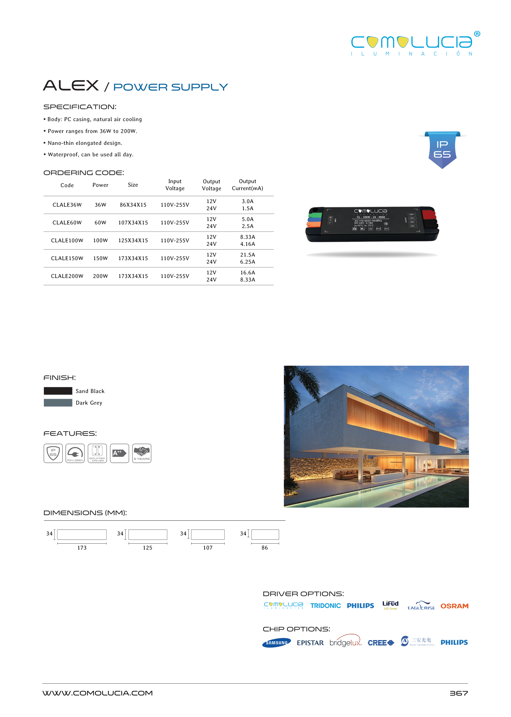- Power ranges from 36W to 200W.