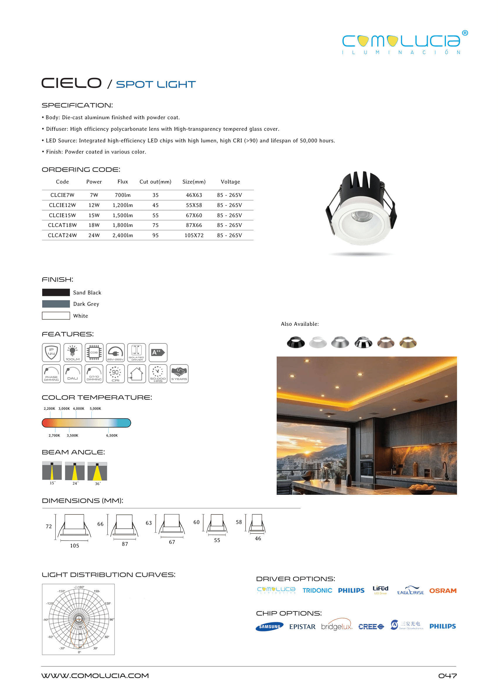 - LED Source: Integrated high-efficiency LED chips with high lumen, high CRI (>90) and lifespan of 50,000 hours. Finish: