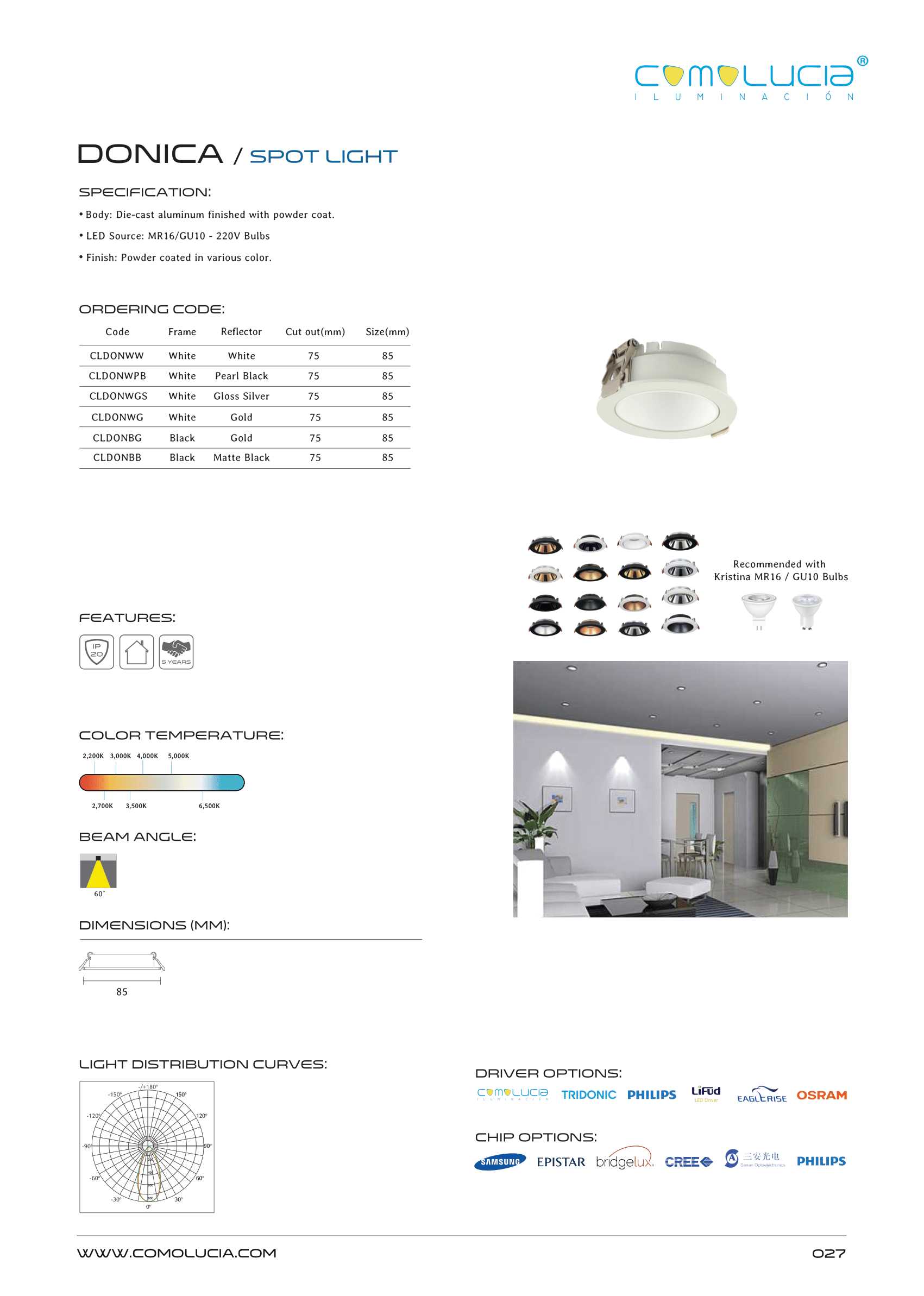 - LED Source: MR16/GU10 – 220V Bulbs