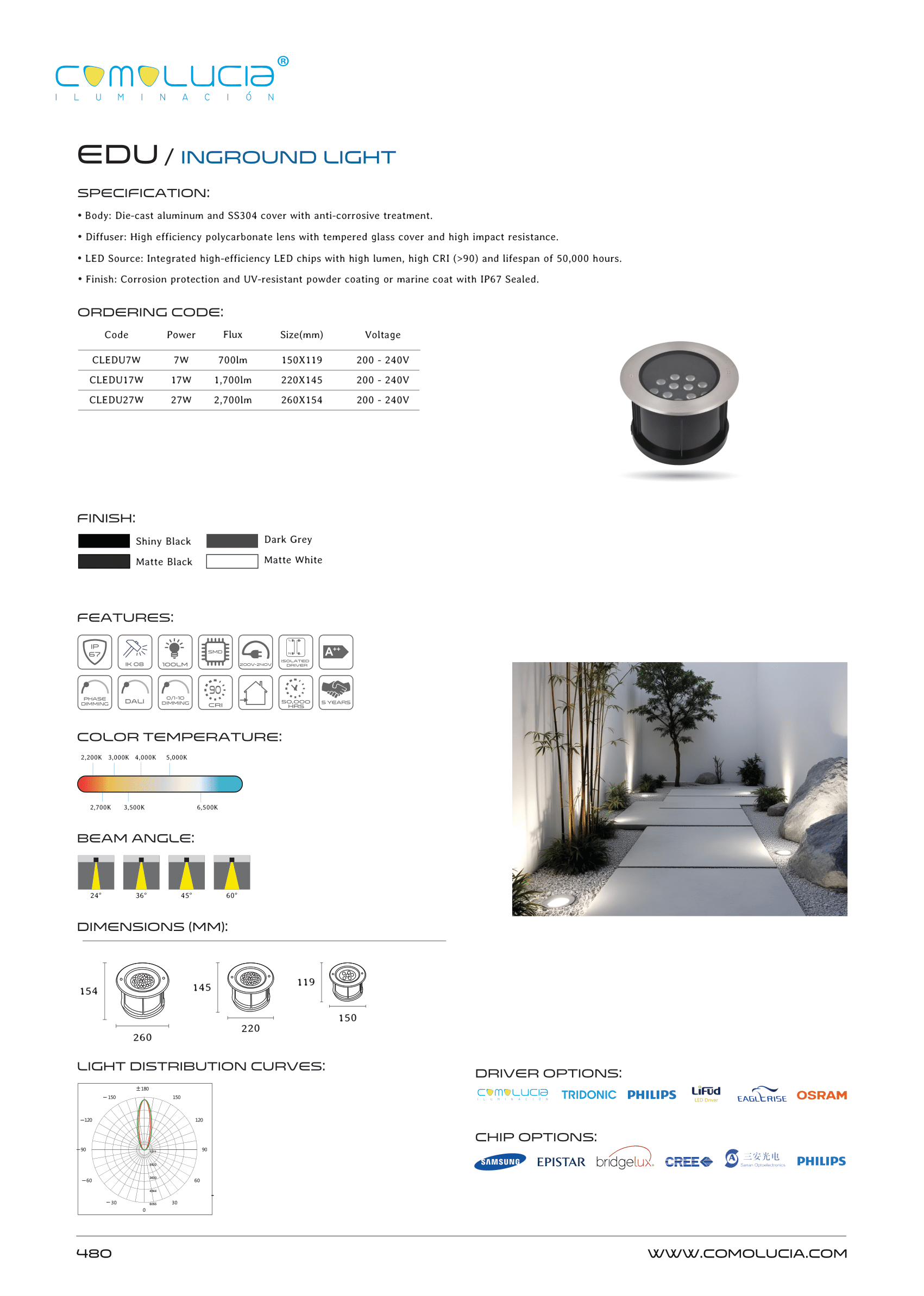 - LED Source: Integrated high-efficiency LED chips with high lumen, high CRI (>90) and lifespan of 50,000 hours.