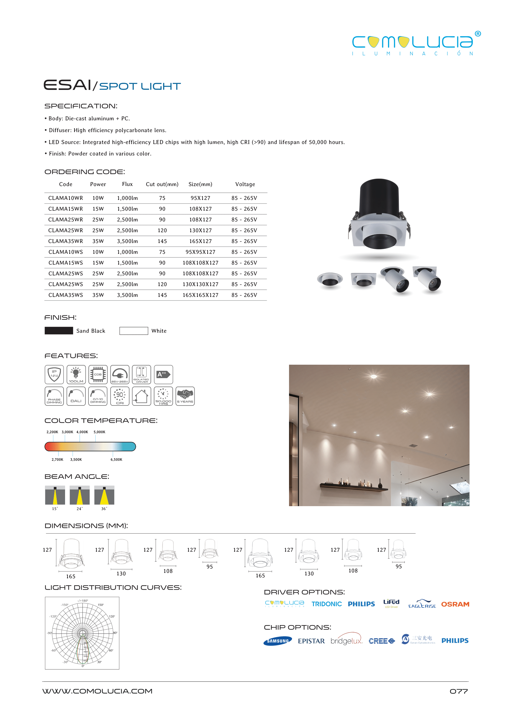 - LED Source: Integrated high-efficiency LED chips with high lumen, high CRI (>90) and lifespan of 50,000 hours.