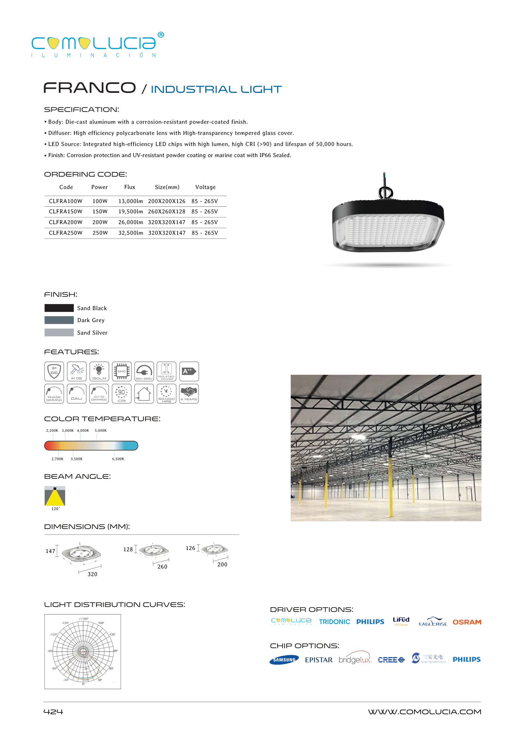 - Diffuser: High efficiency polycarbonate lens with High-transparency tempered glass cover.