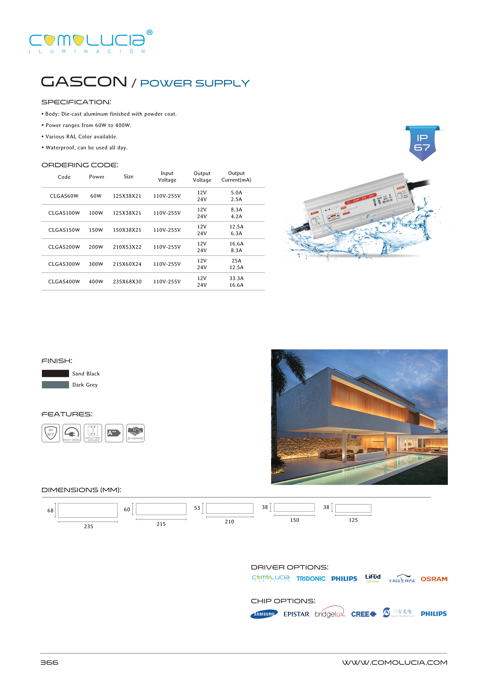 - Body: Die-cast aluminum finished with powder coat.