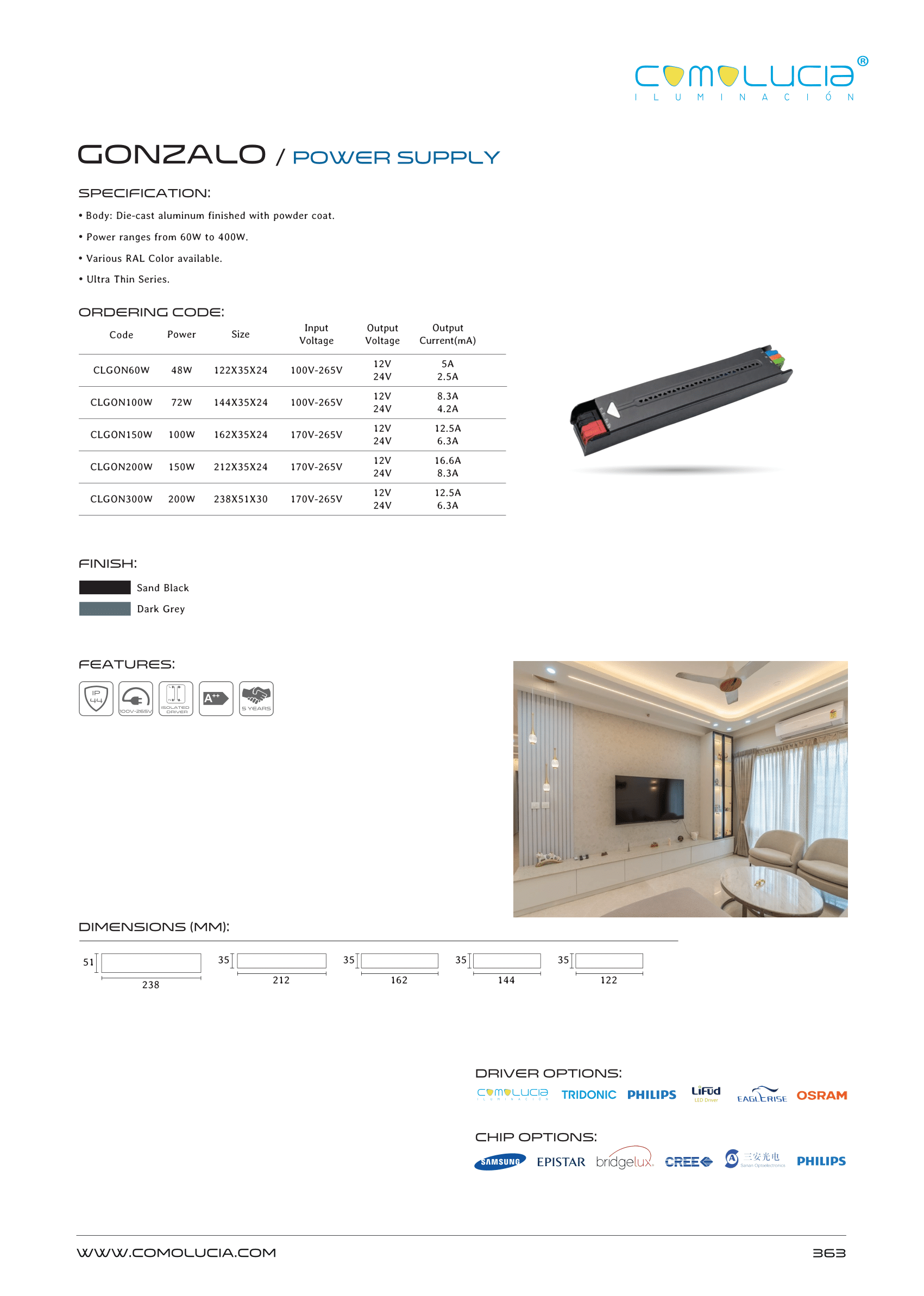 - Body: Die-cast aluminum finished with powder coat.