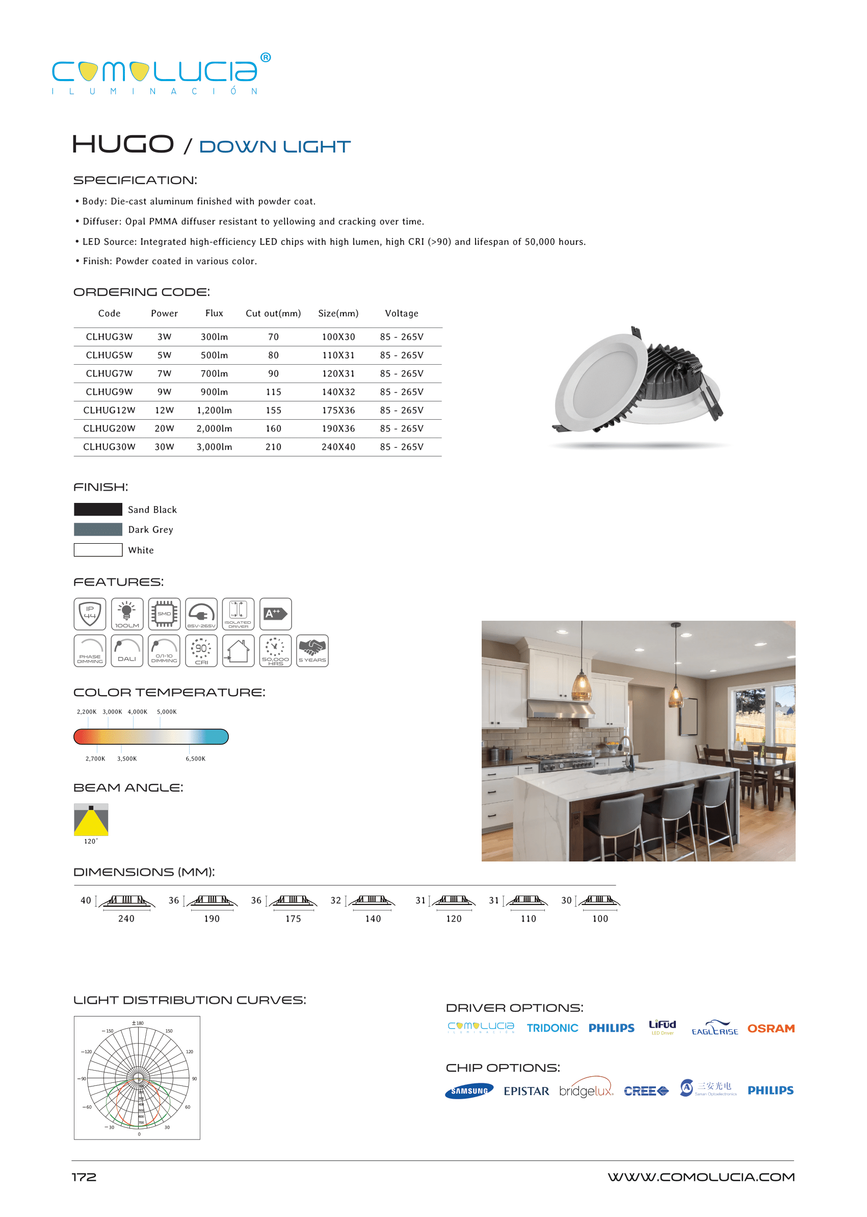 - LED Source: Integrated high-efficiency LED chips with high lumen, high CRI (>90) and lifespan of 50,000 hours.