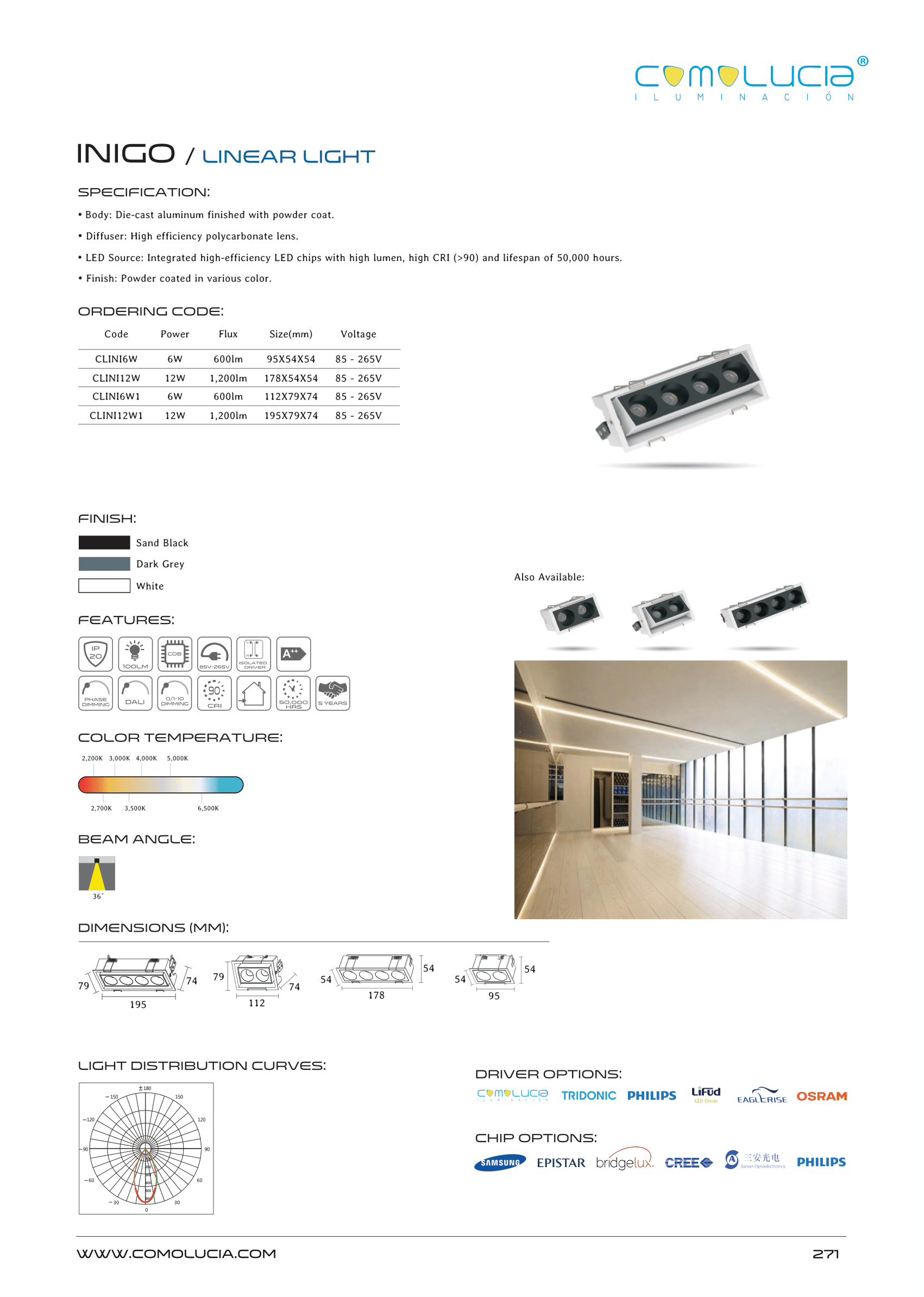 - LED Source: Integrated high-efficiency LED chips with high lumen, high CRI (>90) and lifespan of 50,000 hours.