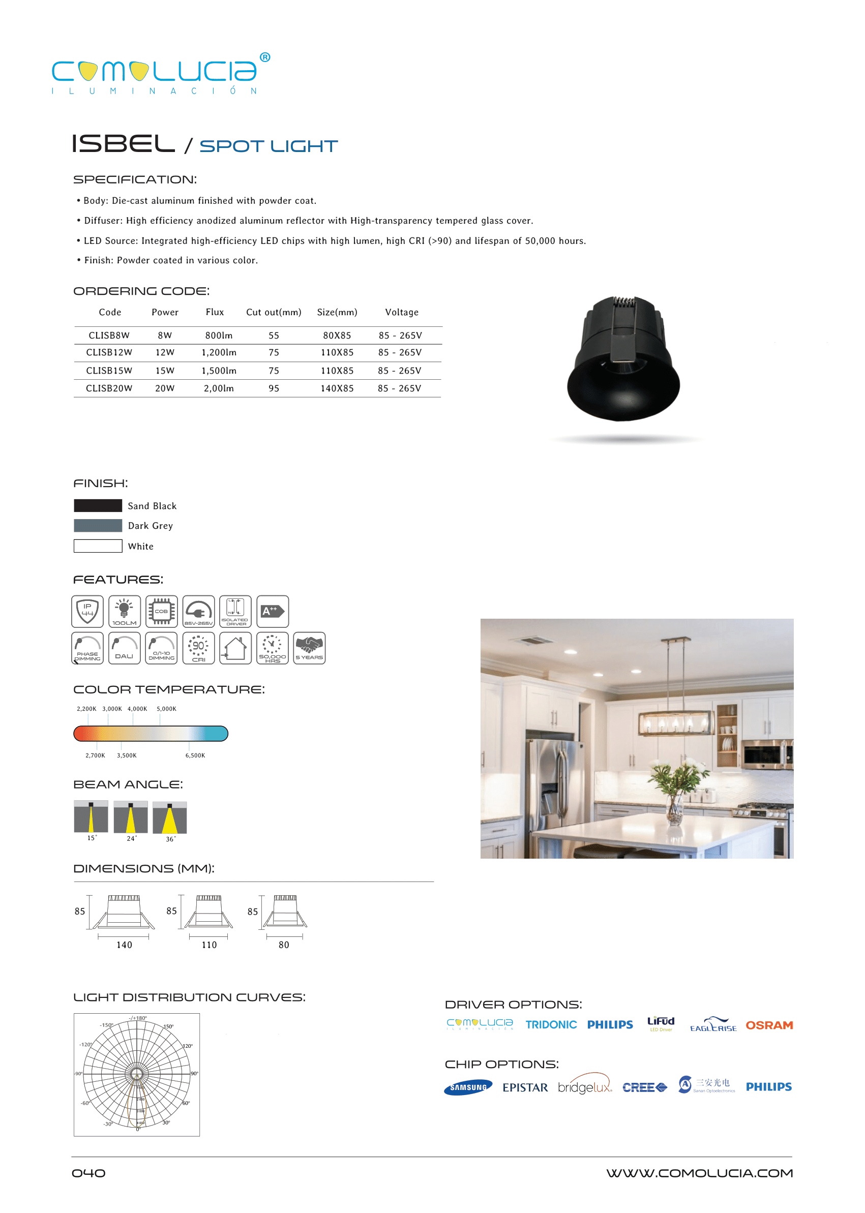 - LED Source: Integrated high-efficiency LED chips with high lumen, high CRI (>90) and lifespan of 50,000 hours. Finish: