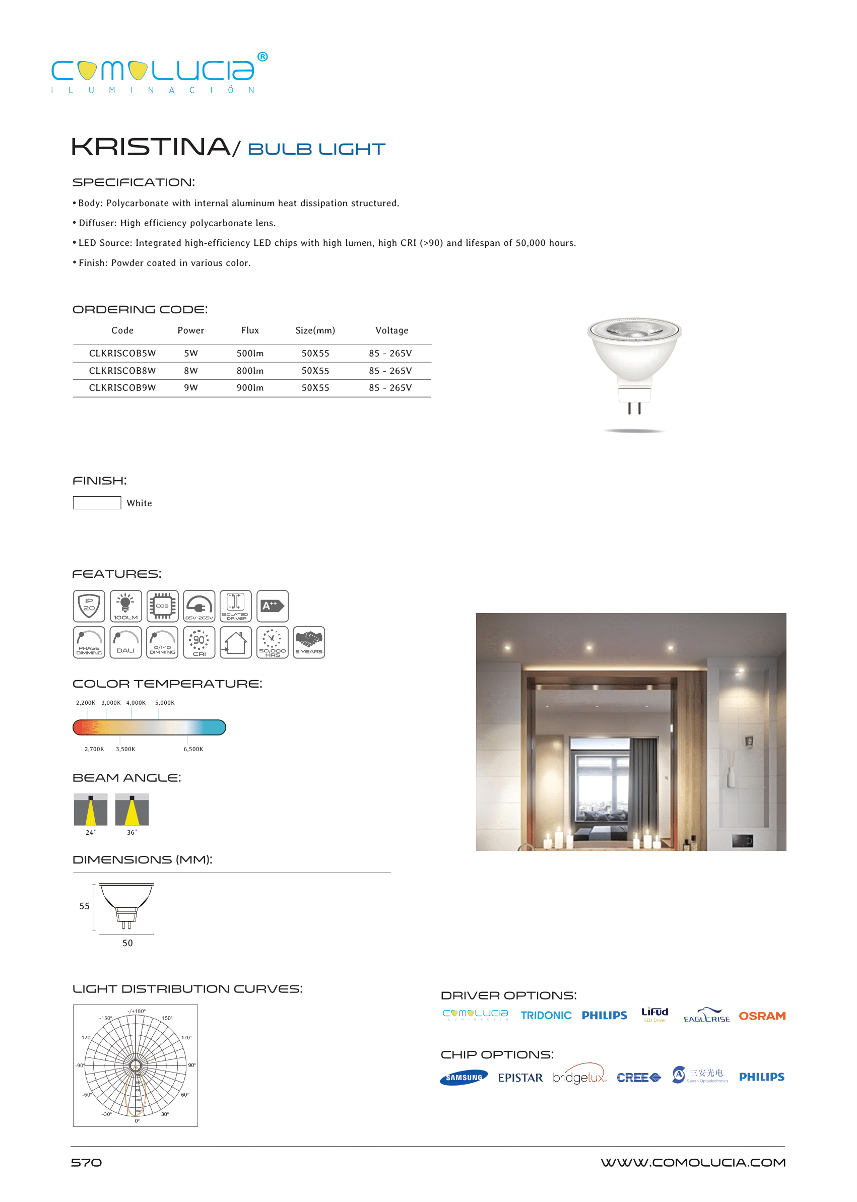- LED Source: Integrated high-efficiency LED chips with high lumen, high CRI (>90) and lifespan of 50,000 hours.
