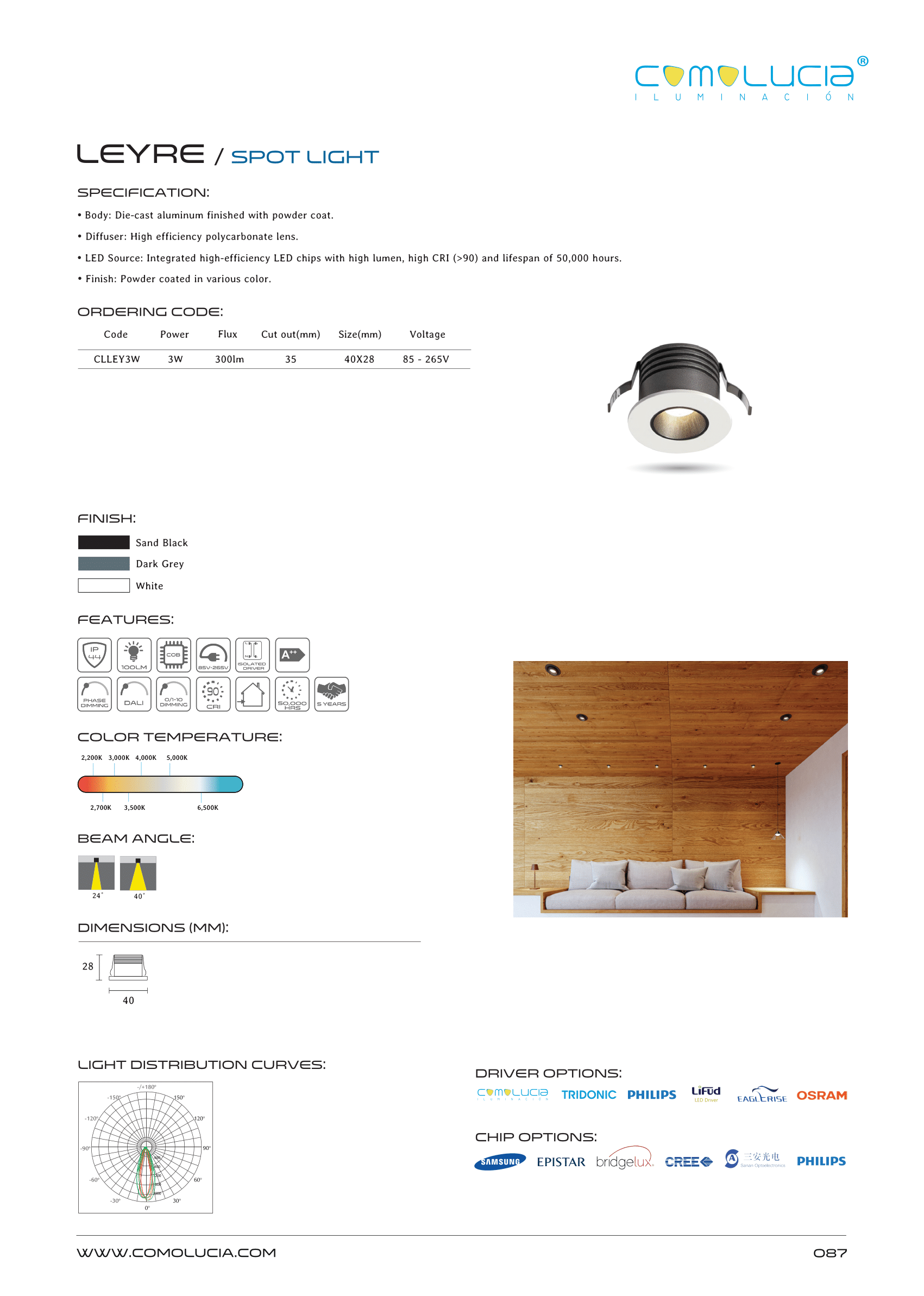 - LED Source: Integrated high-efficiency LED chips with high lumen, high CRI (>90) and lifespan of 50,000 hours.