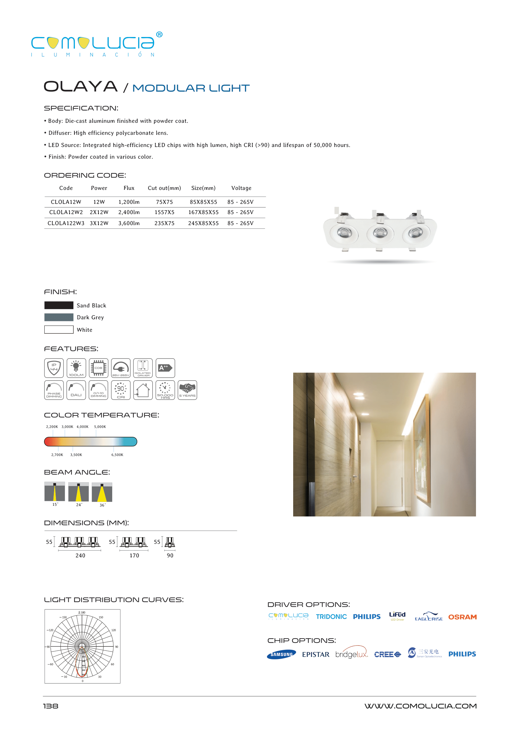 - LED Source: Integrated high-efficiency LED chips with high lumen, high CRI (>90) and lifespan of 50,000 hours.