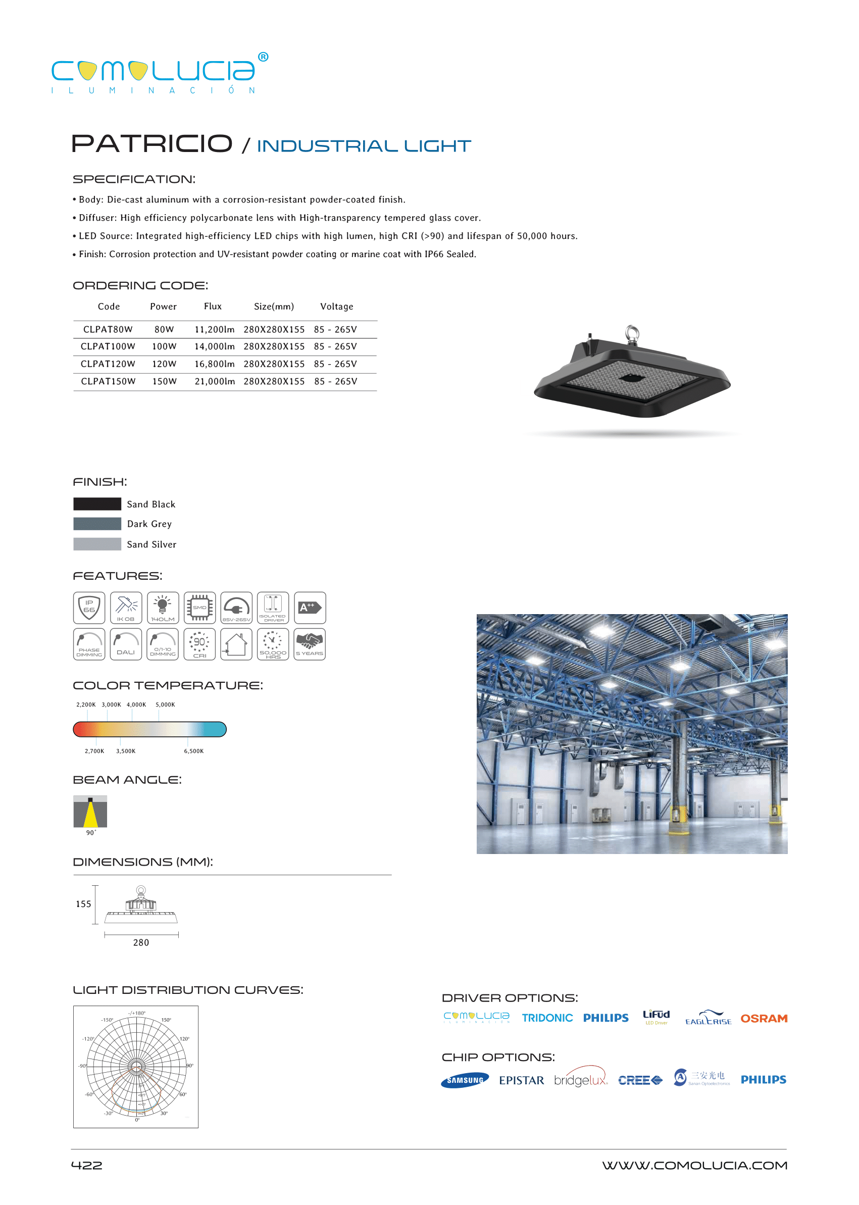 - Diffuser: High efficiency polycarbonate lens with High-transparency tempered glass cover.