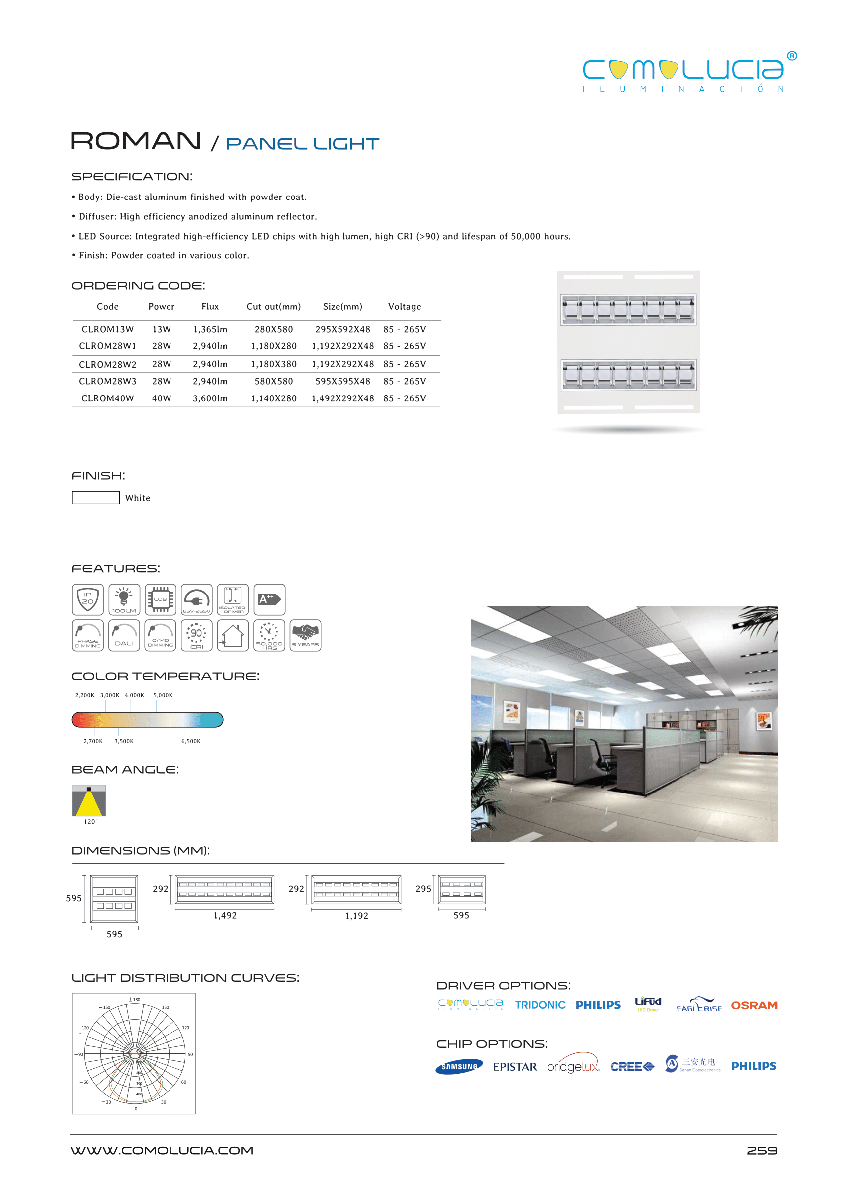 - LED Source: Integrated high-efficiency LED chips with high lumen, high CRI (>90) and lifespan of 50,000 hours.