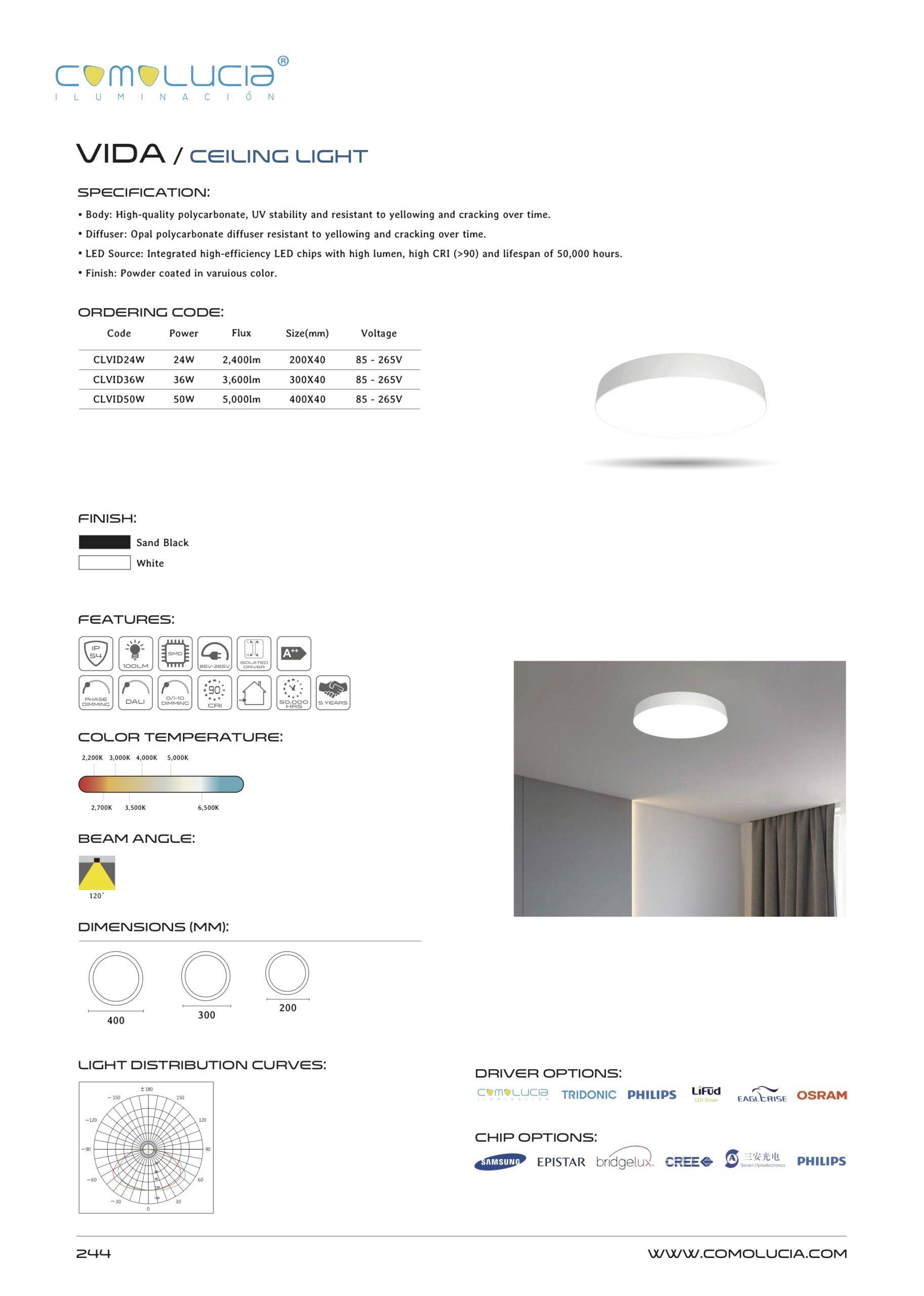 - LED Source: Integrated high-efficiency LED chips with high lumen, high CRI (>90) and lifespan of 50,000 hours.