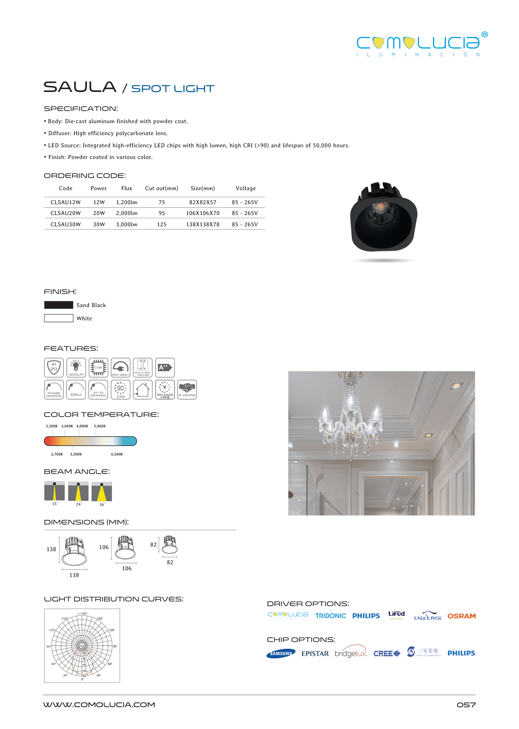 - LED Source: Integrated high-efficiency LED chips with high lumen, high CRI (>90) and lifespan of 50,000 hours.