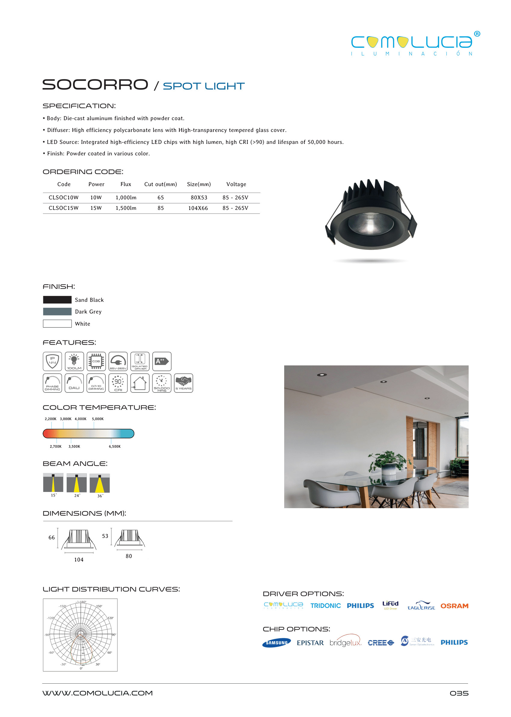 - LED Source: Integrated high-efficiency LED chips with high lumen, high CRI (>90) and lifespan of 50,000 hours. Finish: