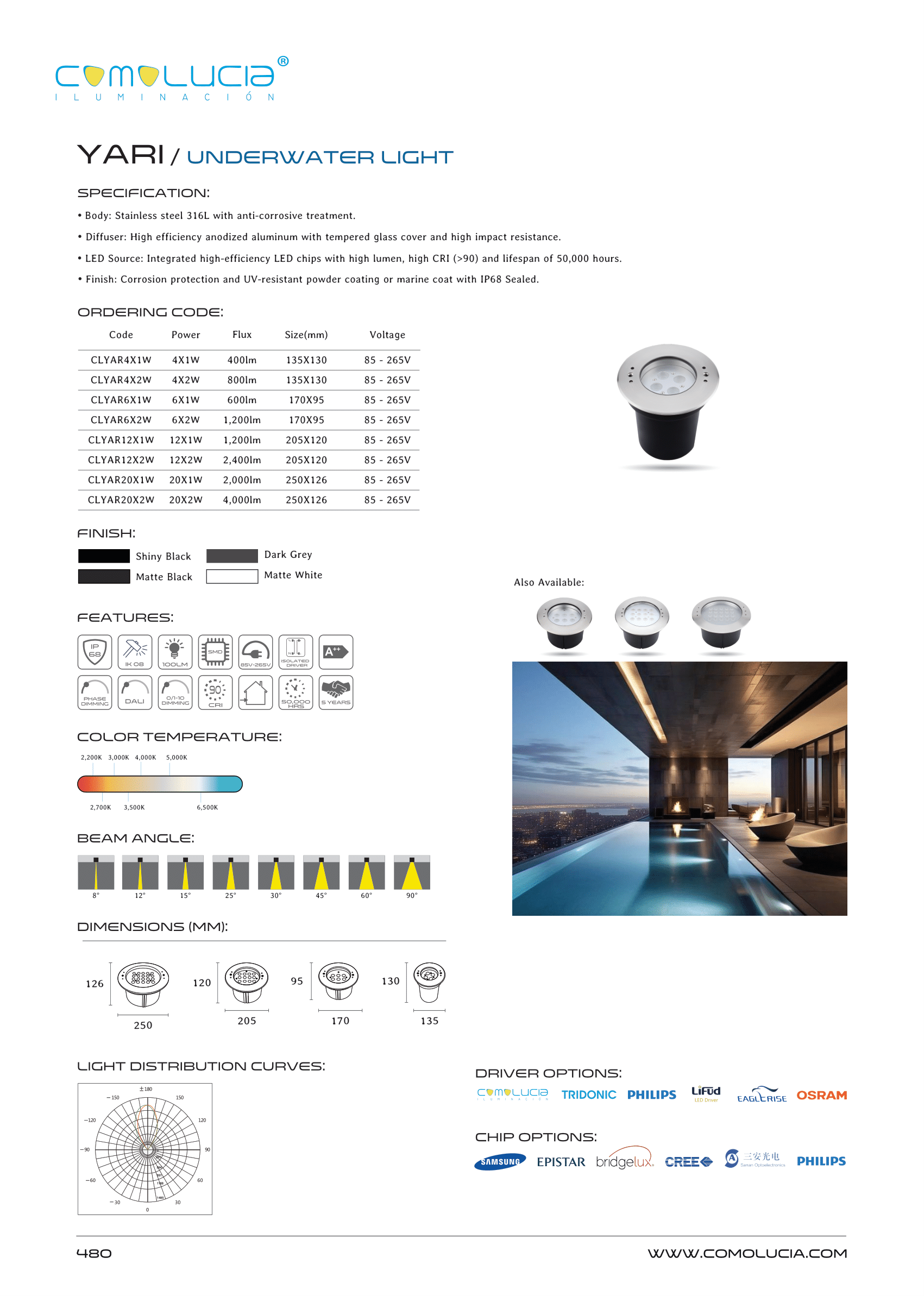 - Finish: Corrosion protection and UV-resistant powder coating or marine coat with IP68 Sealed.