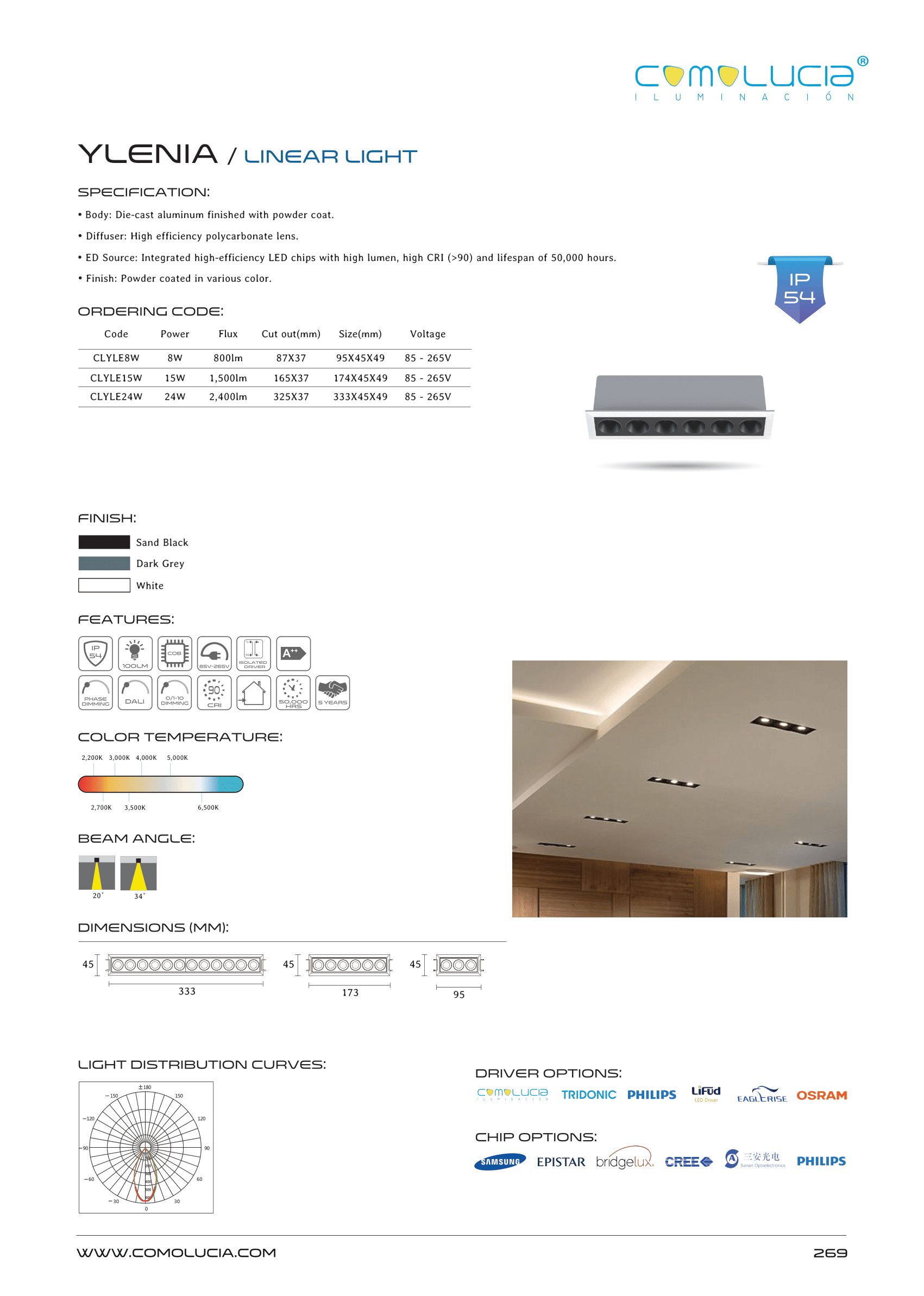 - LED Source: Integrated high-efficiency LED chips with high lumen, high CRI (>90) and lifespan of 50,000 hours.