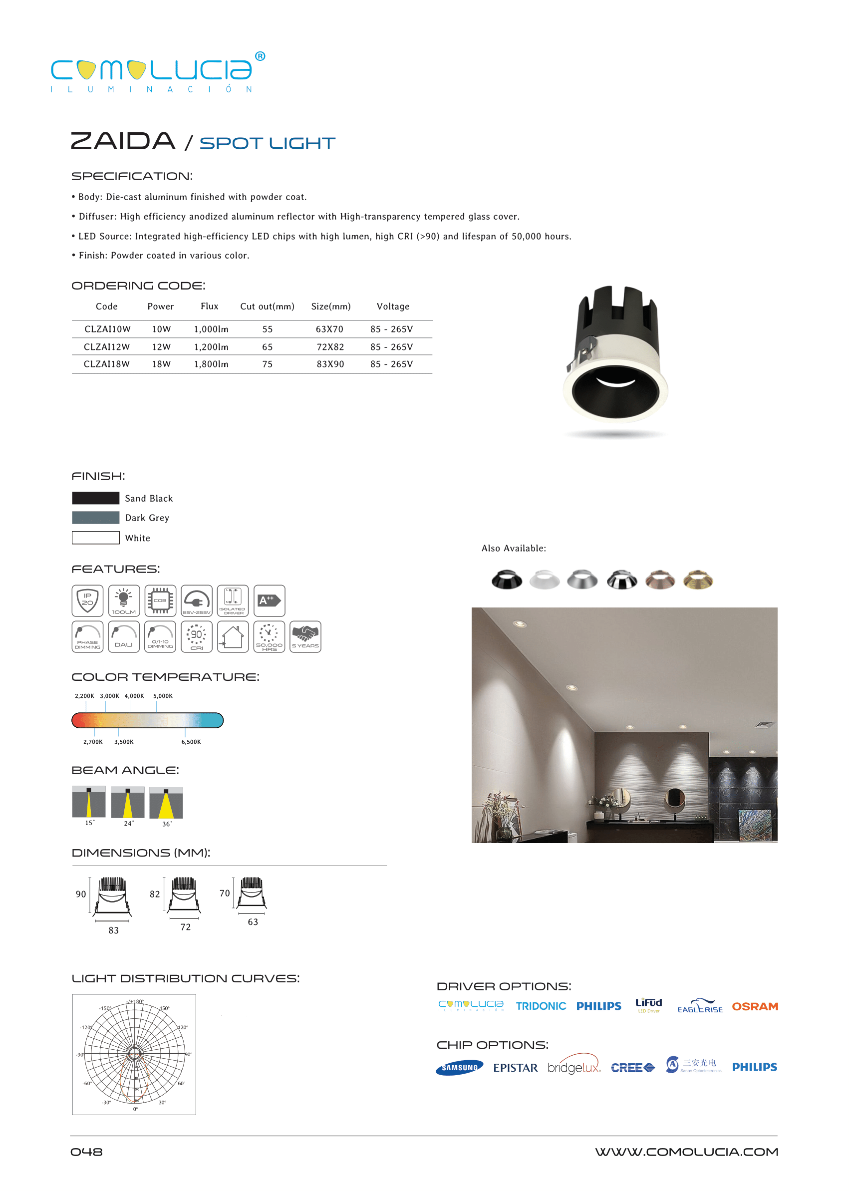 - LED Source: Integrated high-efficiency LED chips with high lumen, high CRI (>90) and lifespan of 50,000 hours. Finish: